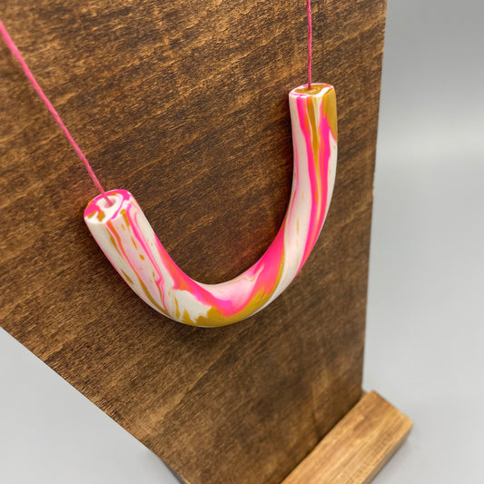 Polymer Clay Tubular Necklace – Marbled Neon Pink, White & Gold